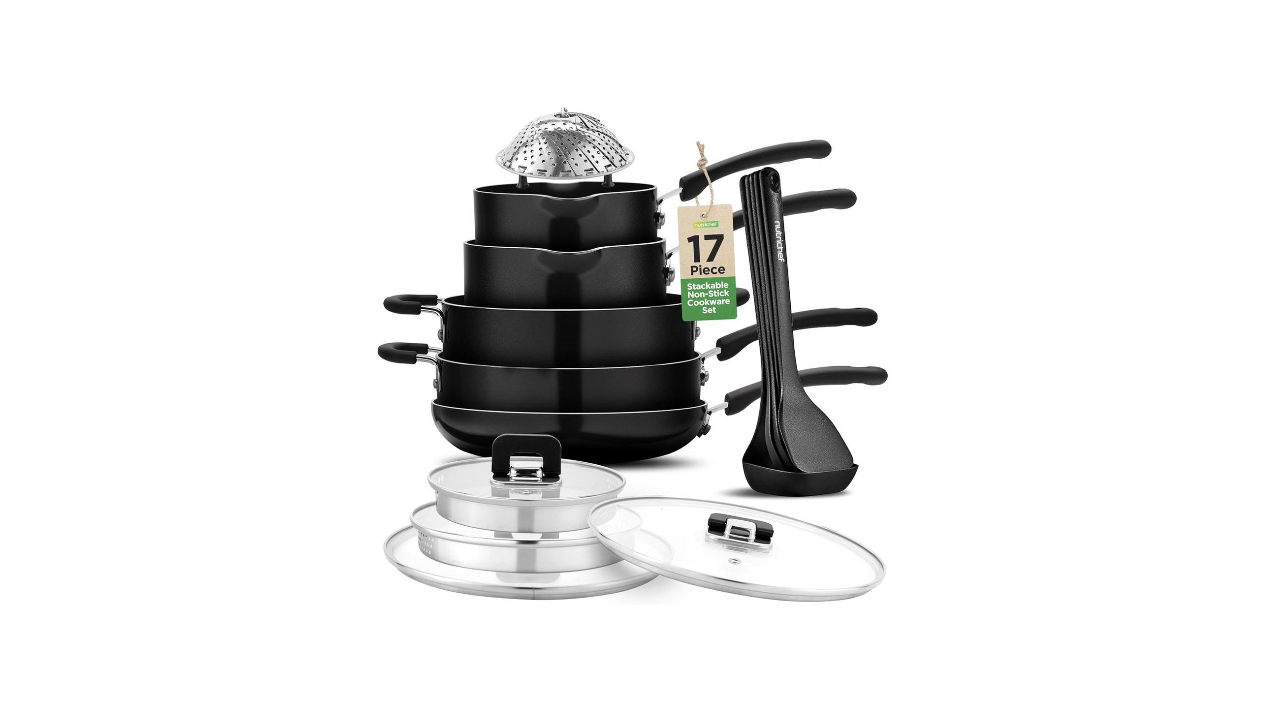 - Tired of clunky cookware taking up precious space in your kitchen or on your adventures? The NutriChef 17pcs Black Stackable Pots and Pans Set, Nonstick Induction Cookware, Space Saving Cookware, Easy Clean, Ideal For RV and Camper, Includes a Foldable Steamer Basket and Cooking Utensils is here to revolutionize your cooking experience, offering a smart and efficient solution for compact living and travel. This comprehensive set is designed to make meal preparation a breeze, from your home kitchen to your favorite campsite.